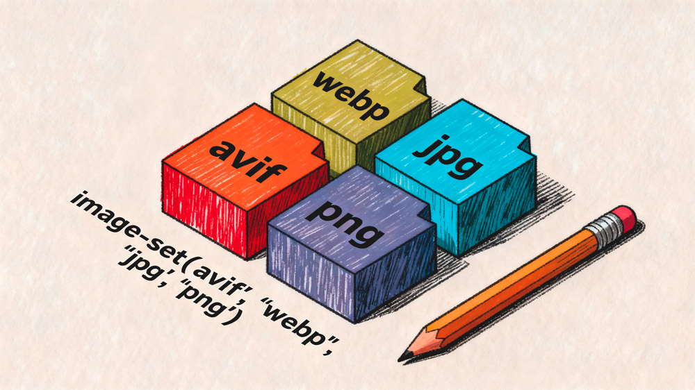 AVIF ו־WebP מאפשרים קבצים קטנים משמעותית בהשוואה ל־JPG או PNG, אבל לא כל הדפדפנים תומכים בהם. הפונקציה image-set מטפלת בזה בצורה אלגנטית, ללא צורך ב־JavaScript או בזיהוי ברמת user-agent.