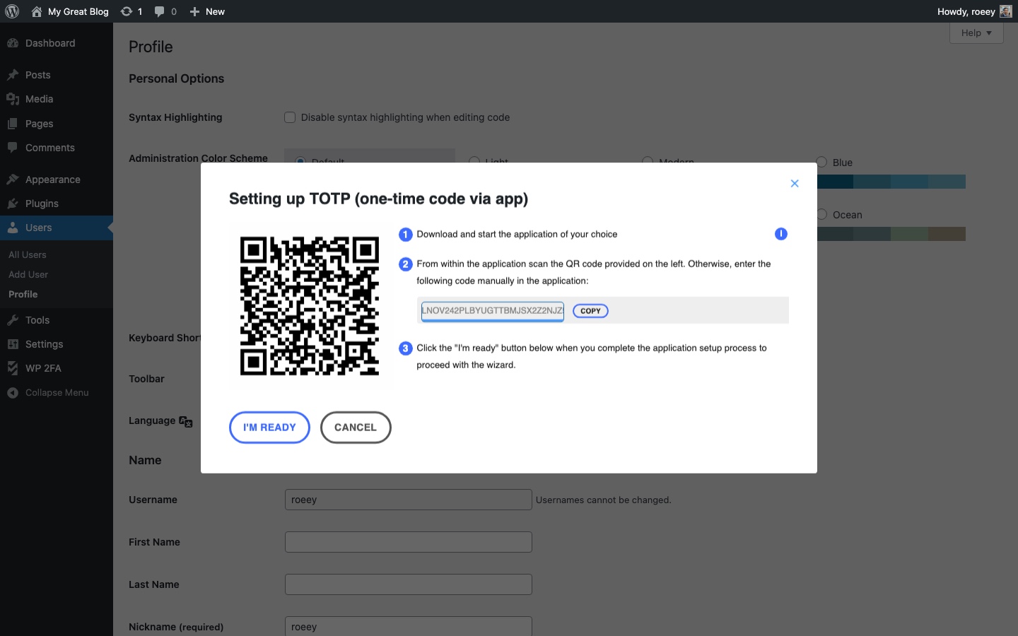אשף ה-WP 2FA ילווה אתכם בהגדרה הראשונית. הוא יבקש מכם לבחור: