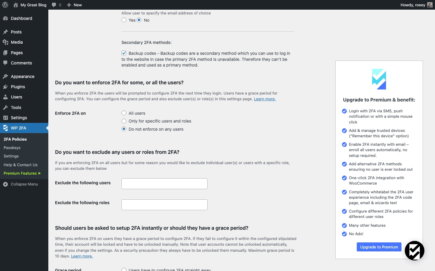 בהגדרות WP 2FA (WP 2FA > 2FA Policies) אפשר:
